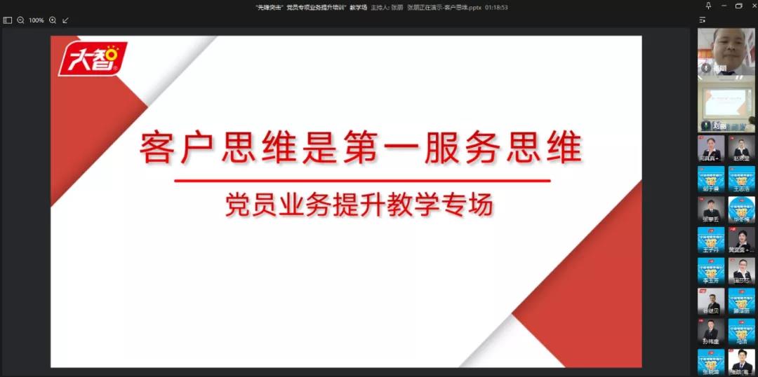 為充分發(fā)揮黨員先鋒模范帶頭作用,全面調(diào)動(dòng)黨員的積極性和創(chuàng)造性,5月19日至20日,大智教育集團(tuán)黨委在集團(tuán)總部組織開展了“先鋒突擊”黨員專項(xiàng)業(yè)務(wù)提升培訓(xùn),共分為教學(xué)顧問專場(chǎng)和學(xué)習(xí)顧問、市場(chǎng)專員專場(chǎng)。集團(tuán)總部和濟(jì)南區(qū)域現(xiàn)場(chǎng)參加,外地區(qū)域視頻連線參加。