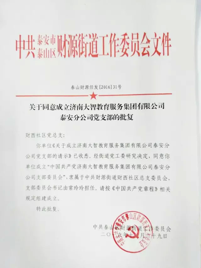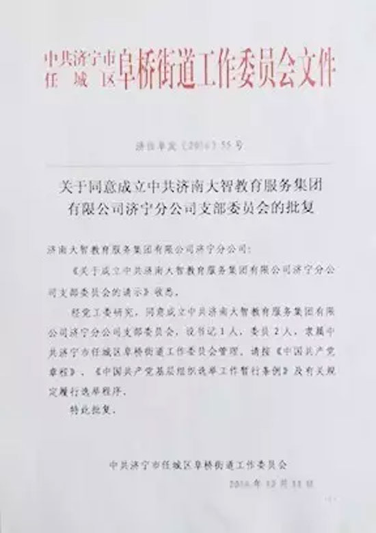春暖花開,萬物復蘇之際,2017年大智黨建工作乘著春風又添喜訊!03月07日,中共濟寧市任城區阜橋街道委員會正式批復同意成立中共濟南大智教育...