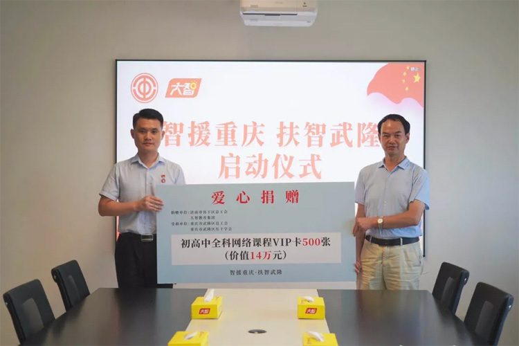 捐贈儀式上,大智為重慶武隆區捐贈總價值14萬元的大智公開課(初高中全科網絡課程)VIP卡500張。