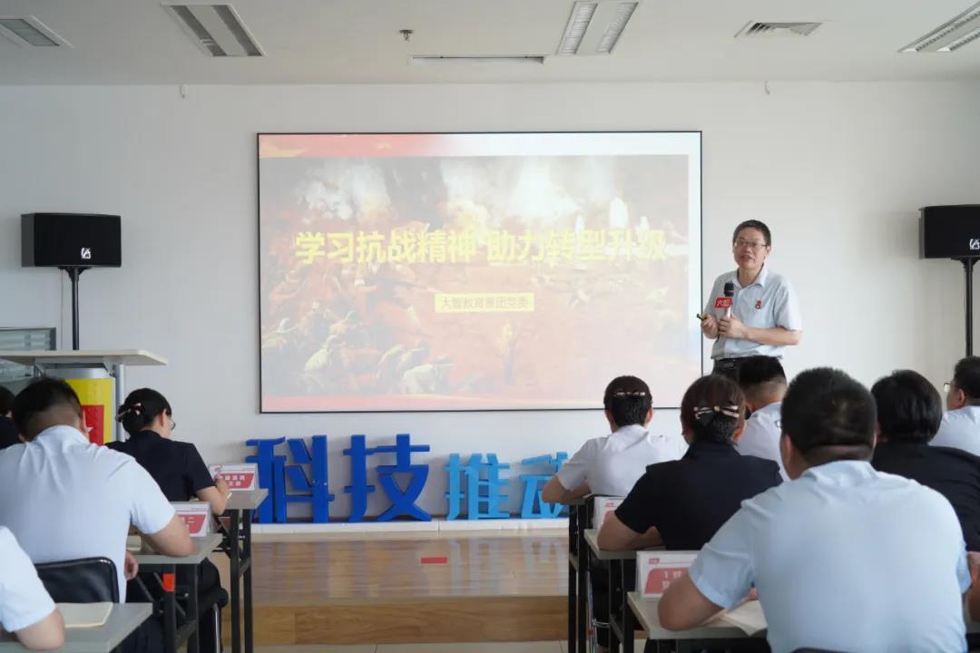 大智教育集團黨委委員劉勤章為黨員們帶來《學習抗戰精神,助力轉型升級》的精彩分享,號召全體黨員深刻感受抗戰精神,在轉型升級的道路上,與大智同呼吸、共命運,實現自身崗位價值。