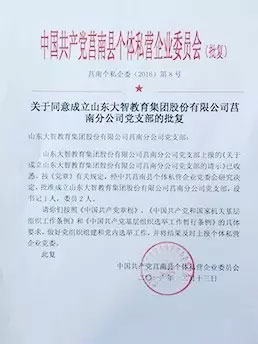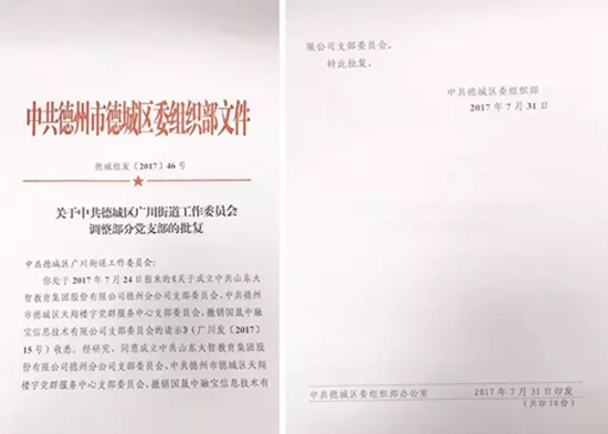 08月02日,中國共產黨德州市德城區委組織部正式批復同意成立中共山東大智控股集團股份有限公司德州分公司支部委員會。 這是大智控股集團黨建...