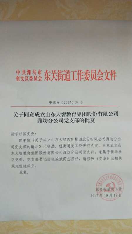 10月19日,中共濰坊市奎文區東關街道工作委員會同意成立山東大智控股集團股份有限公司濰坊分公司黨支部。黨支部書記由張成斌同志擔任。這是大智控...