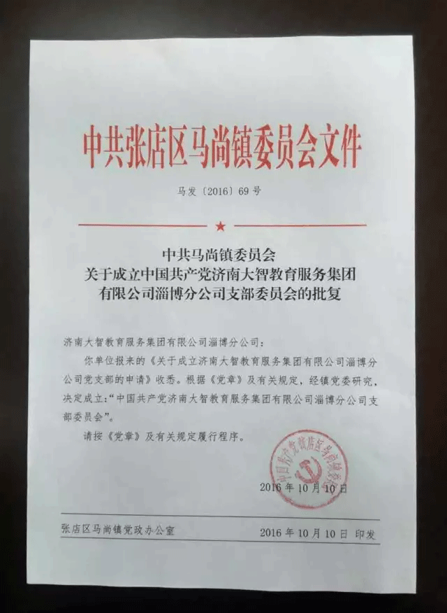 2016年10月10日,中共張店區馬尚鎮委員會正式批復同意成立中共濟南大智教育服務集團有限公司淄博分公司支部委員會。這是大智教育集團繼臨沂分...