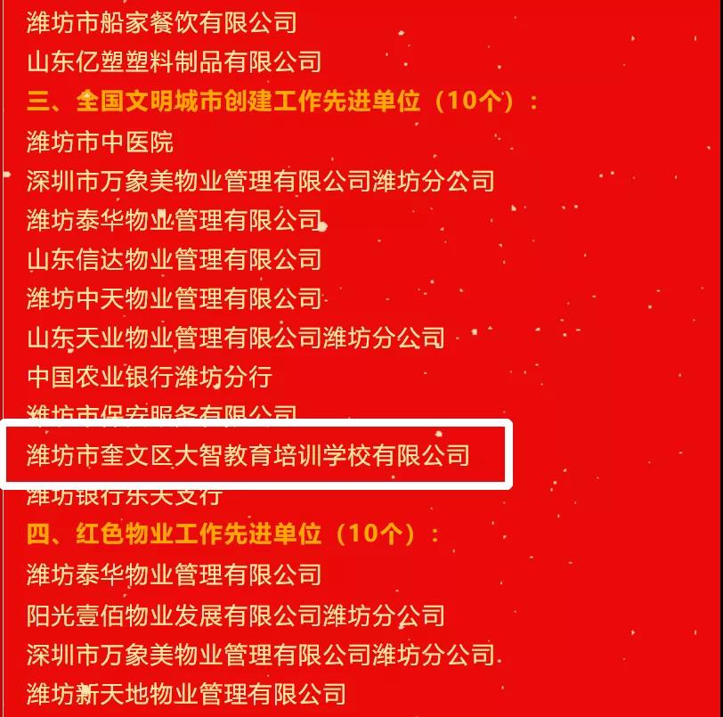 自濰坊市文明城市創建以來,大智濰坊區域拼搏實干,奮勇爭先,做文明創城的宣傳者、踐行者,落實疫情防控工作,深化精神文明創建,積極踐行社會責任,營造了向上向善、文明安全的良好氛圍。近日,大智濰坊區域榮獲“2020年度全國文明城市創建工作先進單位”稱號。