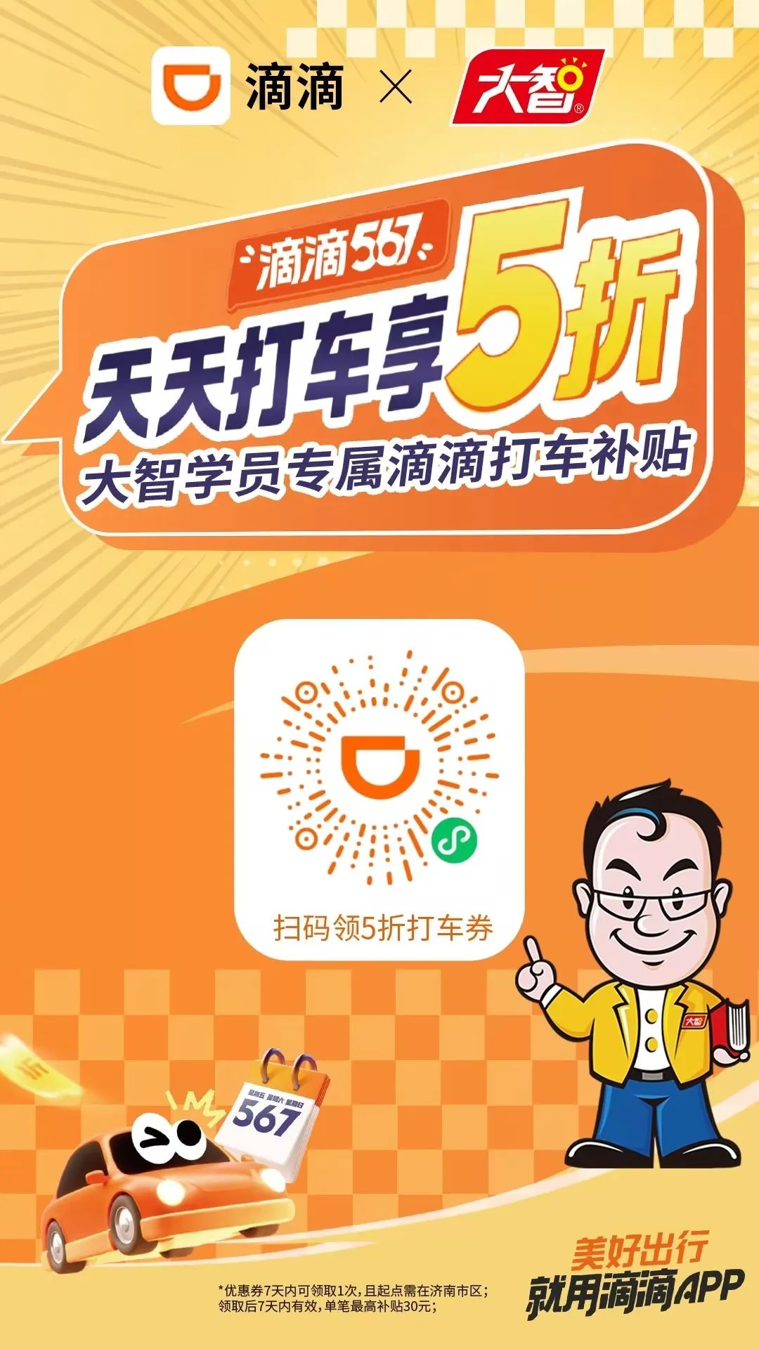 家人們,福利來嘍~這是大智和滴滴合作的“大智學(xué)員定制折扣券”有需要的同學(xué)和家長朋友們可以領(lǐng)一下掃碼領(lǐng)取注:①里面有2張5折券(最多可減30元...
