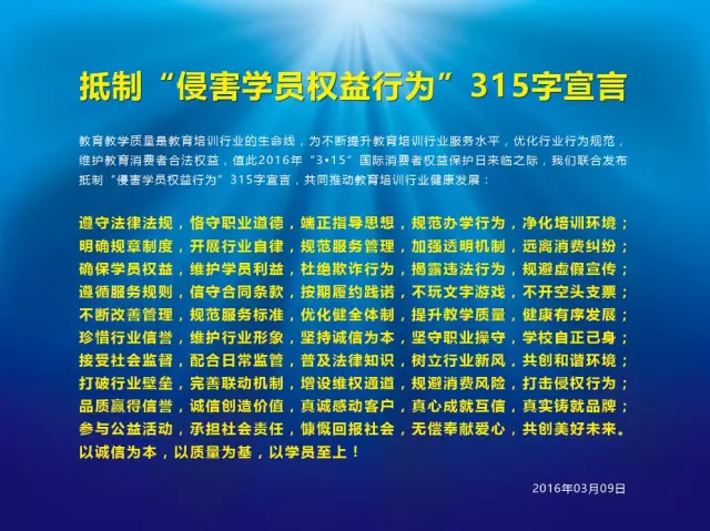 研討會上,教育培訓機構共同發起了抵制“侵害學員權益行為”315字宣言: