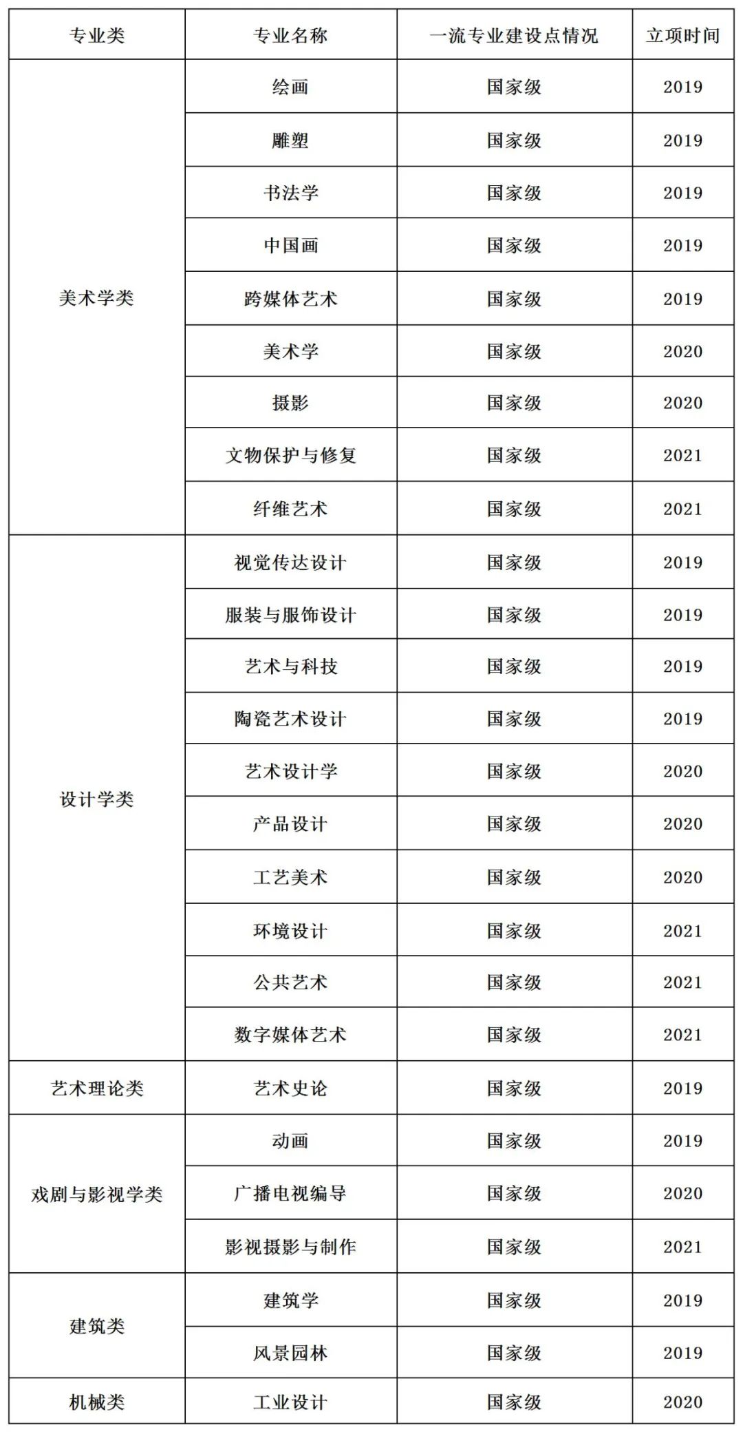 省級一流本科專業(yè)建設(shè)點:動畫、影視攝影與制作、繪畫、雕塑、環(huán)境設(shè)計、產(chǎn)品設(shè)計、數(shù)字媒體藝術(shù)、公共藝術(shù)、美術(shù)學(xué)、藝術(shù)史論、建筑學(xué)、服裝設(shè)計與工程、包裝工程、文化產(chǎn)業(yè)管理、表演、戲劇影視美術(shù)設(shè)計、攝影
