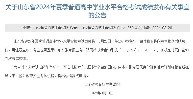 山東省2024年夏季普通高中學(xué)業(yè)水平合格考試成績(jī)于8月22日(今日)10:00發(fā)布。考生可登錄山東省教育招生考試院網(wǎng)站(https://ww...