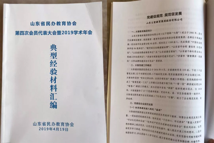 特別值得一提的是,《山東省民辦教育協(xié)會(huì)第四次會(huì)員代表大會(huì)暨2019學(xué)術(shù)年會(huì)典型經(jīng)驗(yàn)材料匯編》刊登了大智“黨建促規(guī)范 規(guī)范促發(fā)展”的典型經(jīng)驗(yàn)材料。