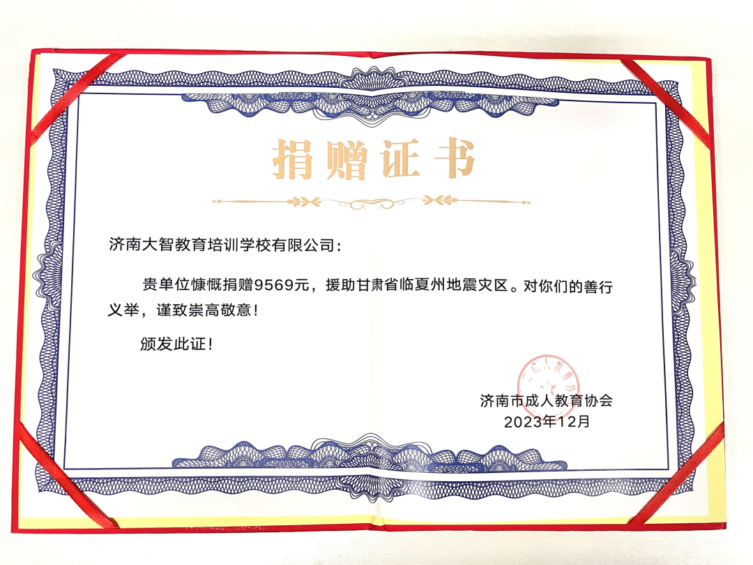 據悉,甘肅省臨夏州發生地震災害,造成了大量人員傷亡和財產損失。濟南市成人教育協會聯合濟南報業集團泉城義工總站、教育事業中心、濟南市教育培訓行業團工委共同發起濟南市教培行業愛心捐贈行動倡議。接到倡議后,大智金復立刻行動,積極捐款,用綿薄之力幫助災區人民重建美好家園。