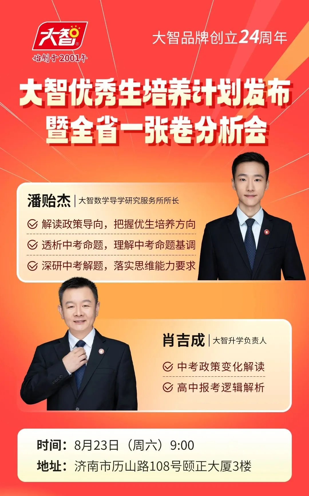 8月23日,大智優秀生培養計劃發布暨全省一張卷分析會在濟南頤正大廈成功舉辦。大智升學負責人肖吉成結合最新教育政策動態,通過數據分析與案例解讀...
