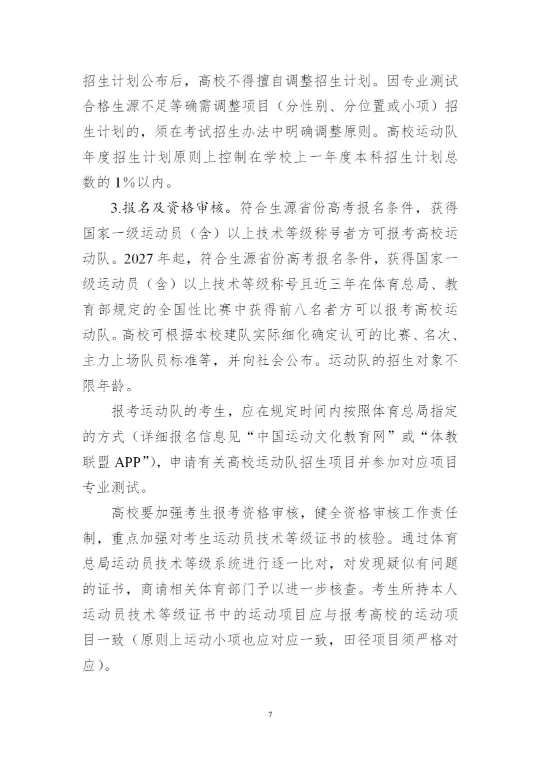 4.平穩做好高水平運動隊考試招生。有關高校要緊緊圍繞高水平運動隊工作定位,根據學校運動隊建設規劃,優化招生項目范圍。要嚴格招生程序,完善評價辦法和招生錄取機制,合理確定文化成績要求。2024年起,高水平運動隊考生文化考試成績全部使用全國統一高考文化課考試成績;專業測試全部納入全國統考,由體育總局牽頭組織實施,高校不再組織相關校考。