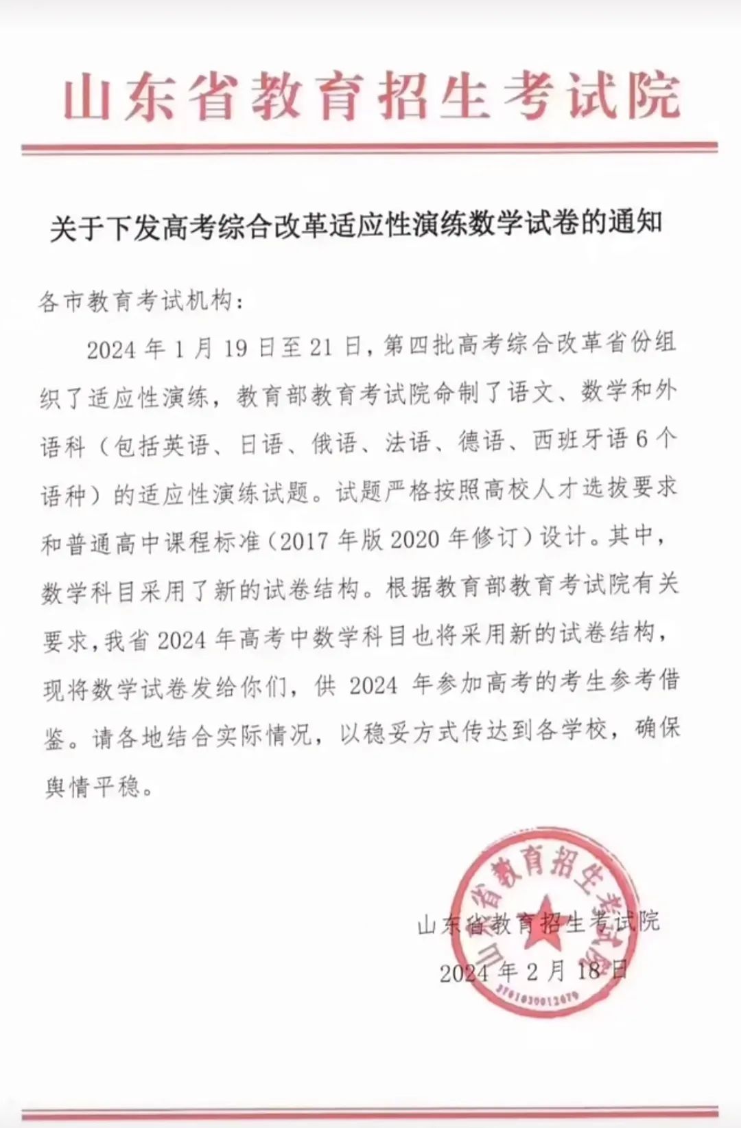 近日,山東省教育招生考試院發布的《關于下發高考綜合改革適應性演練數學試卷的通知》。