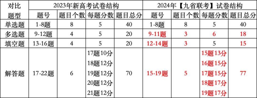 首先,相較于2023年高考,試卷結構發生很大變化,小題分值大幅減少,大題題量減少,但是難度和分值都增加。