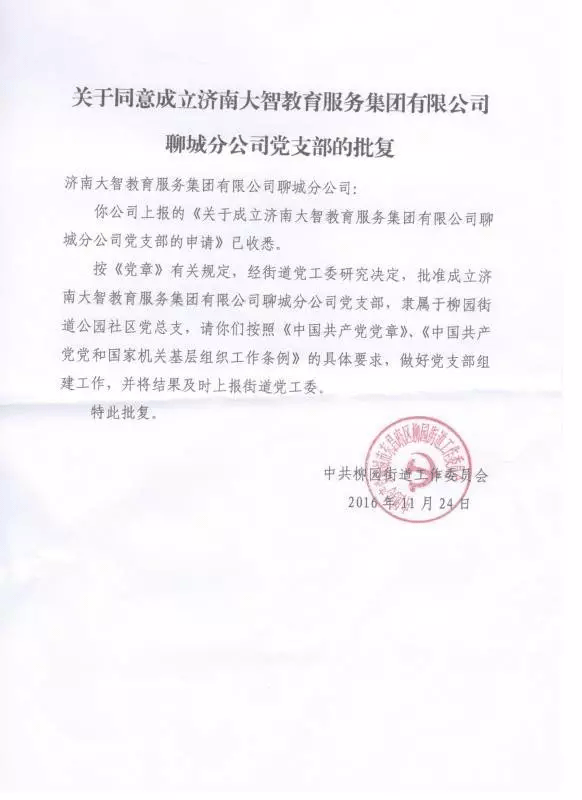 大智控股集團黨建再添新彩,繼青島、臨沂、淄博之后,聊城區(qū)域黨支部正式成立。2016年11月24日,中共聊城市東昌府區(qū)柳園街道工作委員會正式批復同意成立中共濟南大智控股服務集團有限公司聊城分公司支部委員會。