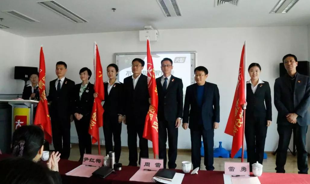 共青團濟南市委副書記王友進,共青團濟南市委組織部部長雷勇、中共濟南市歷下區委常委周雷、共青團歷下區委副書記杜慶姝為“大智青年志愿服務隊”授旗。