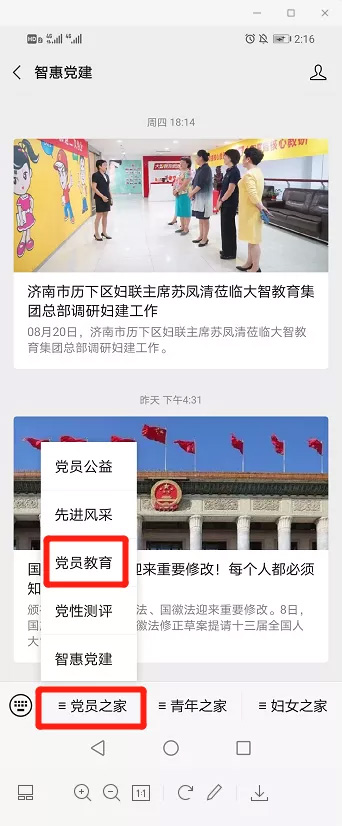 第二步:找到底部菜單“黨員之家”,點(diǎn)擊二級菜單“黨員教育”。