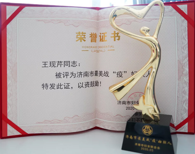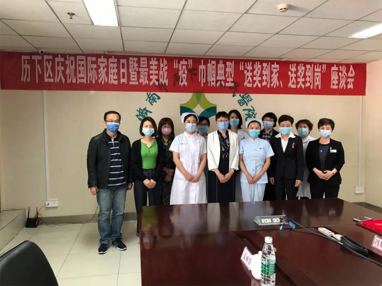 05月13日,濟南市歷下區慶祝國際家庭日暨最美戰“疫”巾幗典型“送獎到家、送獎到崗”座談會在歷下區人民醫院召開。歷下區委副書記尹紅梅,歷下區婦聯黨組書記、主席李健及獲獎代表參會。會上,尹紅梅為大智控股集團黨委書記、婦聯主席王現芹頒發了市區兩級“最美戰‘疫’婦聯人”榮譽獎杯和證書。