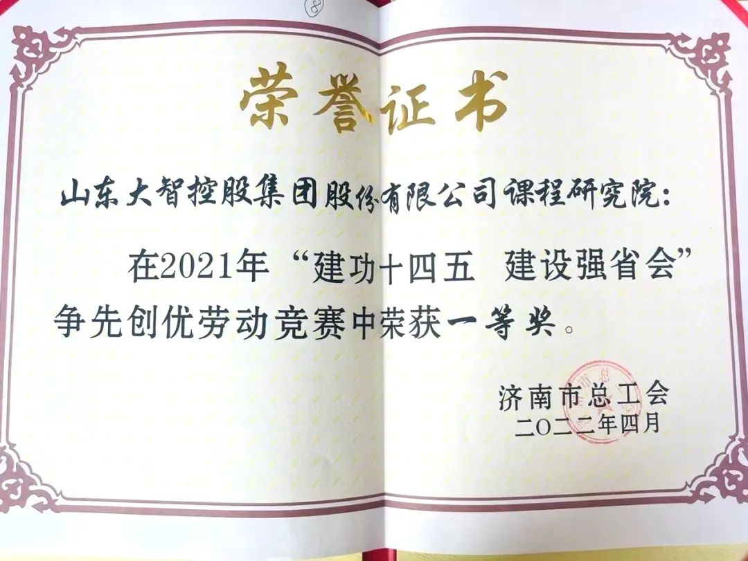 近日,濟南市總工會印發(fā)《關(guān)于表揚2021年“建功十四五 建設(shè)強省會”爭先創(chuàng)優(yōu)勞動競賽優(yōu)秀集體和優(yōu)秀個人的通報》,山東大智控股集團股份有限公司課程研究院榮獲2021年“建功十四五 建設(shè)強省會”爭先創(chuàng)優(yōu)勞動競賽一等獎。