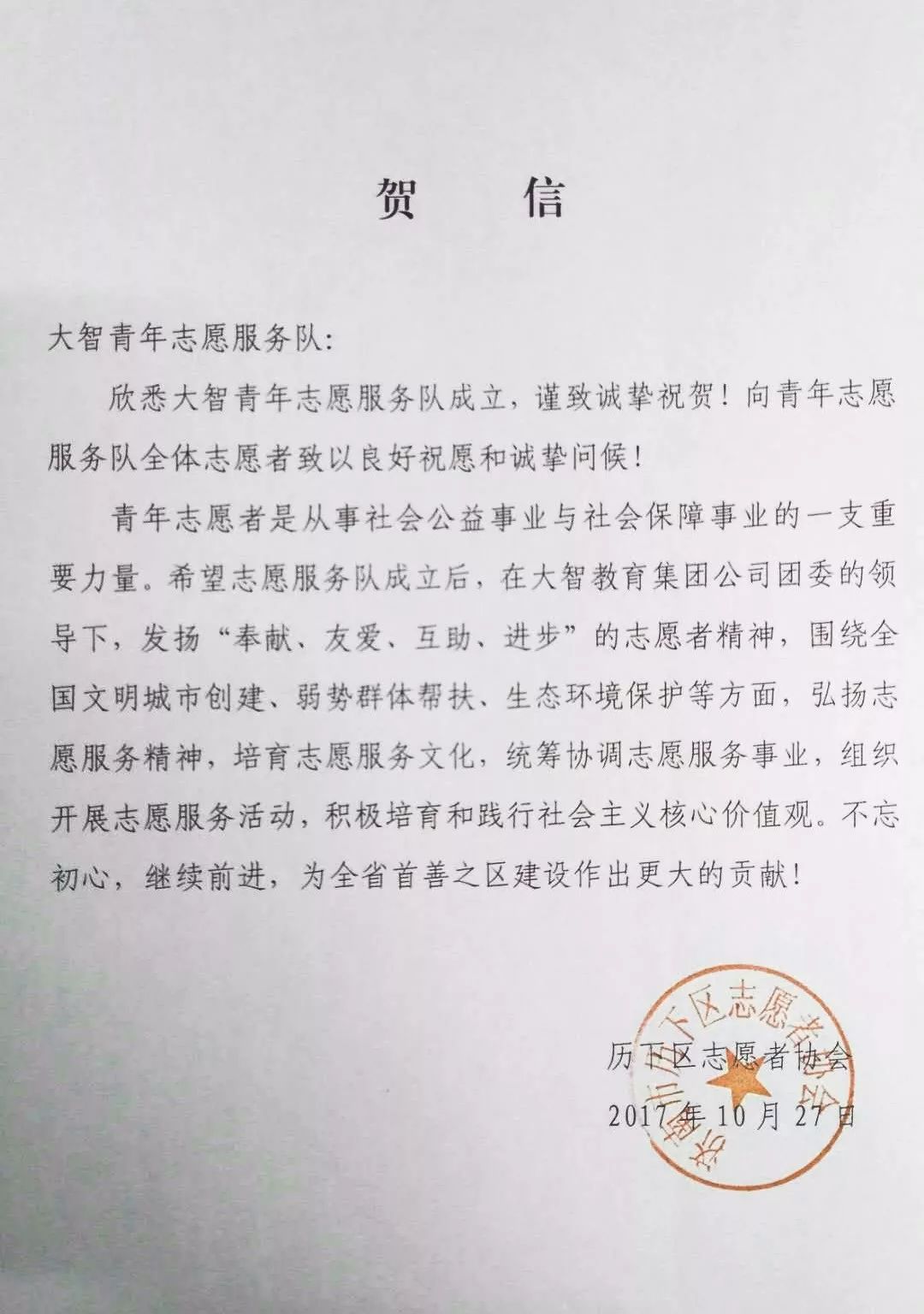 共青團歷下區委同意成立大智青年志愿服務隊。